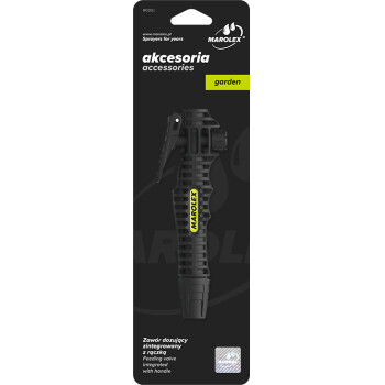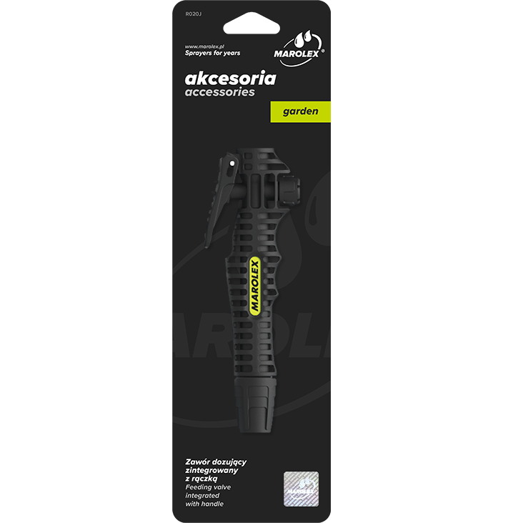 Дозирующий клапан интегрированный с рукояткой профилирован таким образом, чтобы как можно лучше соответствовала анатомической форме ладони, а также обеспечивает надежную фиксацию и точное дозирование средств, как для праворуких, так и для леворуких пользователей. Нажатие и перемещение кнопки дозирующего клапана вперед блокирует его в открытом положении, что дает возможность на непрерывную работу опрыскивателя без необходимости удерживания кнопки. Поршенек дозирующего клапана оснащен двойным уплотнением, которое действует как автоматическая смазка, которая продлевает бесперебойную работу клапана. В рукоятке имеется фильтр, ограничивающий количество частиц, которые могут забивать распылительные форсунки.