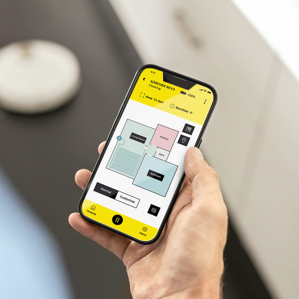 Аппарат RCV 3 можно легко включить кнопкой на корпусе или подать ему команду начала уборки со смартфона. В приложении можно также предварительно составить индивидуальный график уборки. Информация о том, что в работу аппарата требуется вмешательство его владельца, во многих ситуациях выдается в речевой форме.