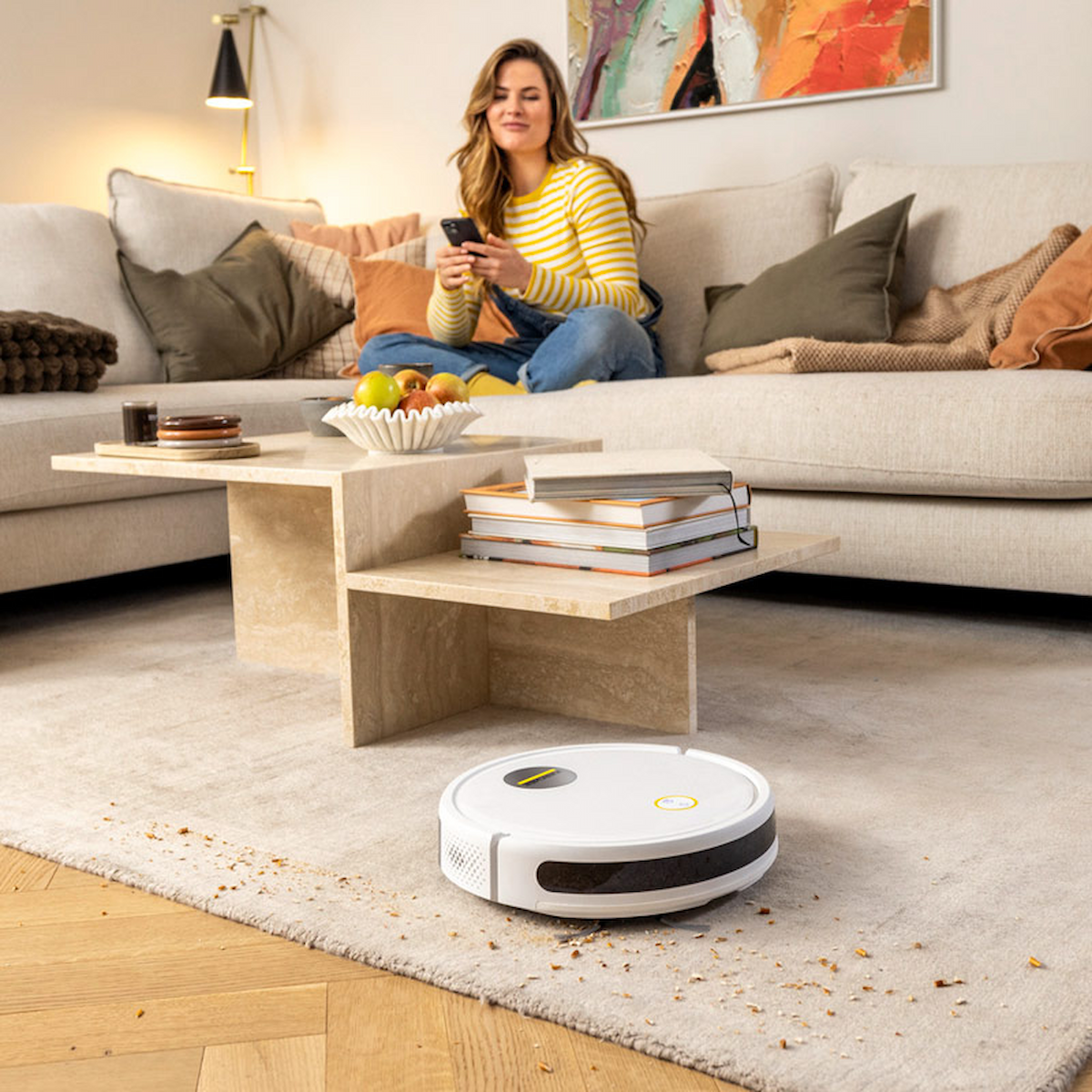 Аппарат оснащен дополнительными датчиками, предотвращающими его падение с высоты (например, с лестницы). Начало уборки может быть удобно инициировано со смартфона с установленным мобильным приложением, с пульта дистанционного управления или нажатием кнопки на корпусе RCV 2. В приложении можно настраивать режимы работы и задавать индивидуальные планы уборки.